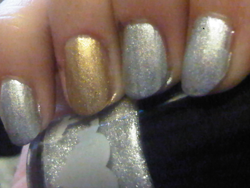I chose to do both Gilded Angel and Annual Emotion because silver and gold sounded simple enough to not eat too much time and I had an idea for a nail design =D This is two coats of each.