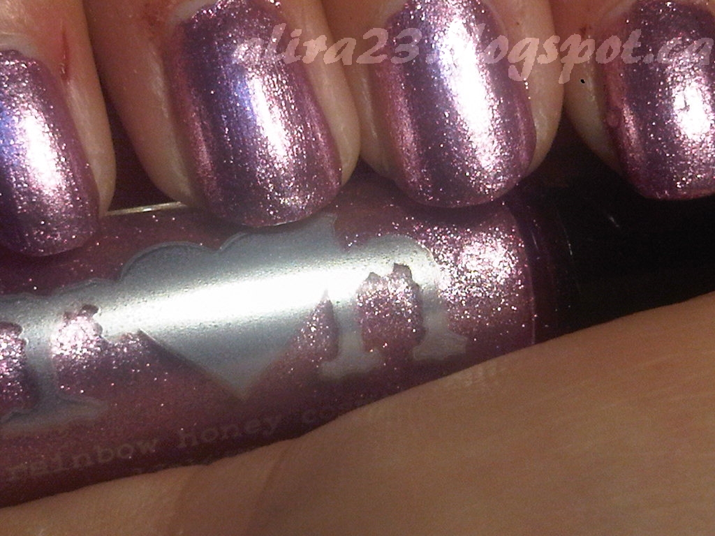 It's really pretty and quite subdued. It's not the best colour on my skin but Branden's mom loved this. I'm supposed to remember to take it to her actually, along with these next two. I decided it needed something extra so I pulled up one of my favourite glitter mixes, RH The Worst Possible Thing (Rarity<3!!) with Sally Hansen Urban Chic since the sun was out and I could use some rainbows.