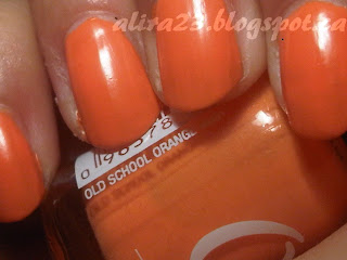 Orly Old School Orange, just like Viridian Vinyl and Purple Pleather is a waxy semi-matte finish. It's bright and perfect for summer <3 I did three coats, formula was okay.